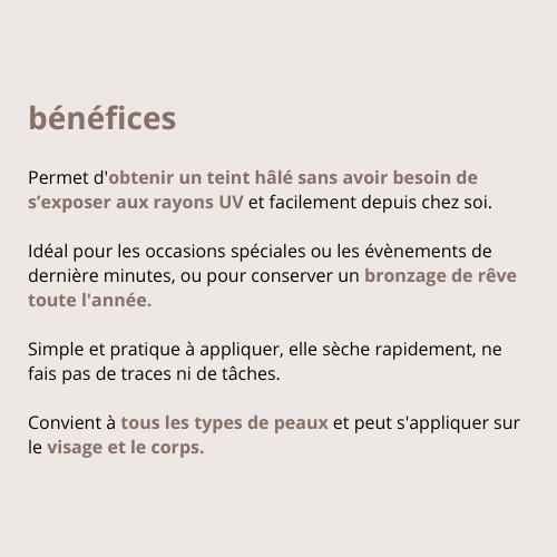Absolument ! Notre mousse autobronzante est formulée avec des ingrédients premium pour t'offrir un bronzage uniforme, naturel et durable. Tu peux obtenir des résultats visibles en quelques heures seulement, sans avoir à t'exposer au soleil. De plus, notre formule est facile à appliquer et ne laisse pas de traces, ce qui te permet d'obtenir un bronzage parfait à chaque application.